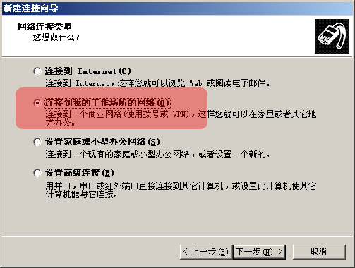 第三步:选择“连接到我的工作场所的网络”,点击“下一步”