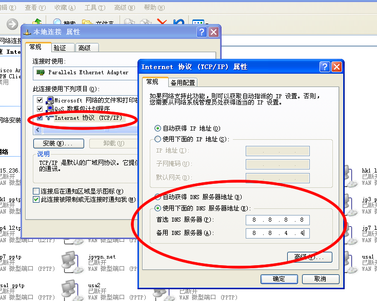 请注意:Windows XP系统有可能存在DNS解析错误问题,导致能成功连接jpnet但是不能上一些网站。请将打开您的“网络连接”, 将所有“本地连接"和ADSL连接(如果存在的话)的DNS地址改成: